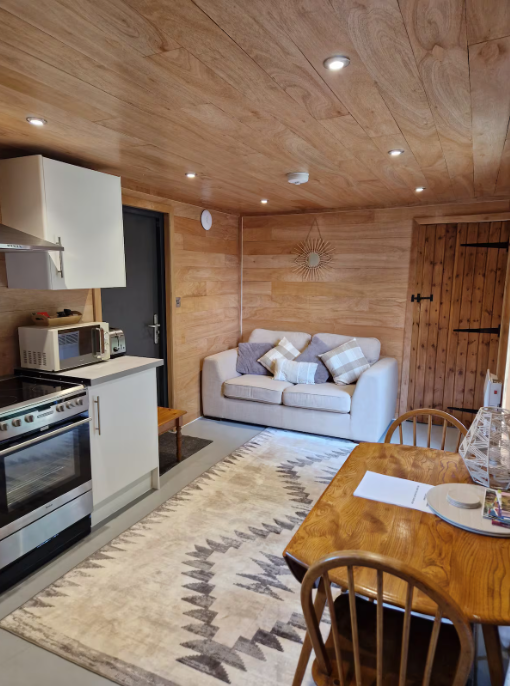Kitchenette/ living room, twin beds, bathroom, private garden and parking with countryside views.