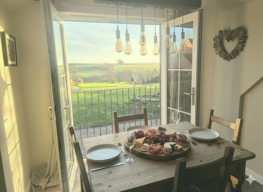 Acorn Lodge in Milwich, Staffordshire is the perfect countryside getaway for a family or a couple, 2 bedroom self-catering cottage with a hot tub and log burner with countryside views stretching out in front of you, this barn conversion is the epitome of relaxing retreat.